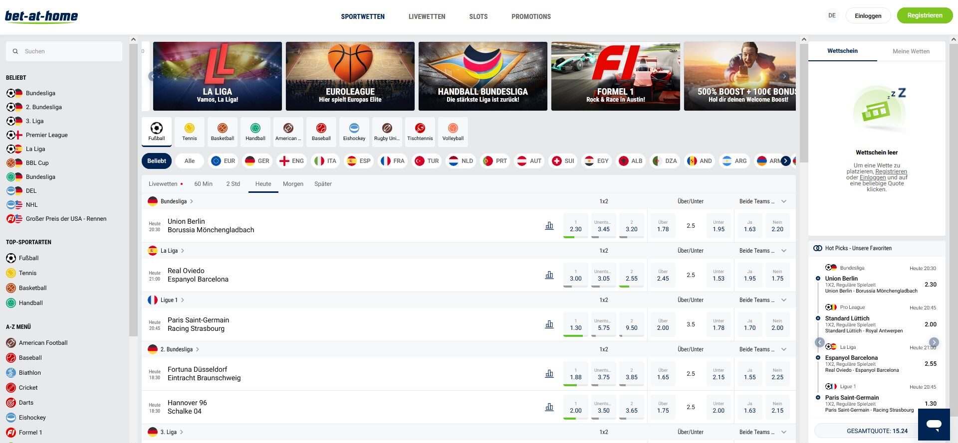 bet-at-home bietet seinen Nutzern ein umfangreiches Wettangebot mit über 40 Sportarten, die sowohl populäre Disziplinen als auch Nischensportarten umfassen. Das Hauptaugenmerk liegt auf Fußball, mit Wetten auf über 100 Ligen weltweit, darunter die Bundesliga, Premier League und La Liga. Neben Fußball können Nutzer auch auf Tennis, Basketball, Eishockey, Handball, Volleyball, American Football, Cricket, Formel 1, Golf, Snooker, Darts, Boxen, Rugby, Baseball, Tischtennis, Badminton, Biathlon, Ski Alpin, Rallye, Bandy, Leichtathletik, Olympische Spiele, Esport, Politik und Unterhaltung wetten. Diese Vielfalt ermöglicht es den Nutzern, auf eine breite Palette von Ereignissen und Wettbewerben zu setzen. Die bet-at-home App bietet dabei eine benutzerfreundliche Oberfläche und ermöglicht es, bequem von unterwegs auf alle verfügbaren Sportarten und Veranstaltungen zuzugreifen. Mit dieser breiten Auswahl an Sportarten stellt bet-at-home sicher, dass für jeden Wettbegeisterten das passende Angebot dabei ist. (Stand 17.10.2025)